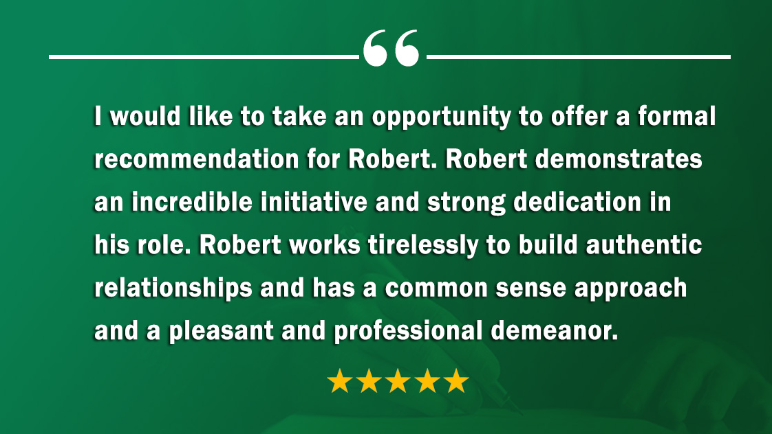 I would like to take an opportunity to offer a formal recommendation for Robert. Robert demonstrates an incredible initiative and strong dedication in his role. Robert works tirelessly to build authentic relationships and has a common sense approach and a pleasant and professional demeanor. His skill set is superb. I would highly recommend Robert in all circumstances.